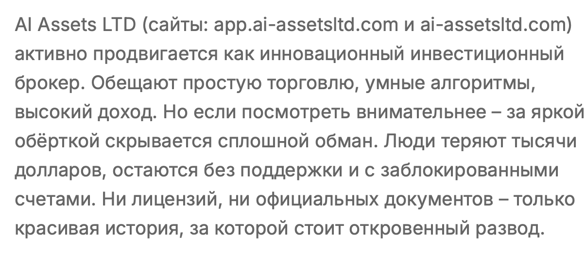 AI Assets LTD не предоставляет реальных гарантий доходности. Пользовательские отзывы часто негативные, включая жалобы на: