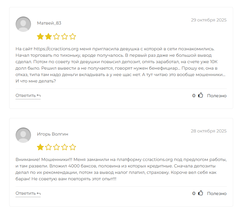 С Ccractions (ccr-actions.com) нужно быть крайне осторожным: проверяйте каждый шаг, не поддавайтесь на обещания мгновенной прибыли и не доверяйте необоснованным гарантиям платформы.
