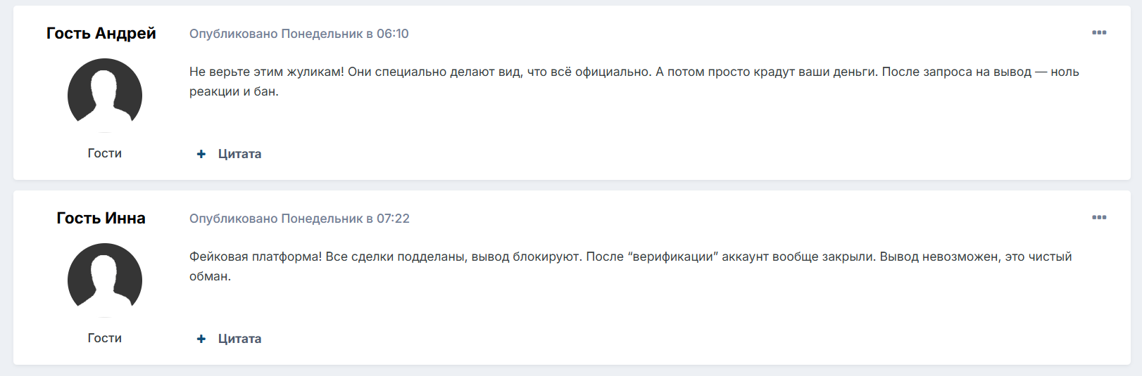 Отзывы пользователей подтверждают: деньги задерживаются или исчезают, поддержка часто игнорирует запросы, а обещанная прибыль остаётся виртуальной. Любые инвестиции через платформу сопряжены с высокой опасностью потери средств. Даже минимальные депозиты могут исчезнуть быстрее, чем пользователь успеет осознать, что произошло.