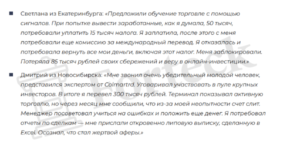 Colmartrd позиционирует себя как брокера международного уровня. Красивая реклама, громкие слова о “современных решениях” и “анализе рынка” — всё сделано по шаблону типичного псевдоинвестиционного проекта.