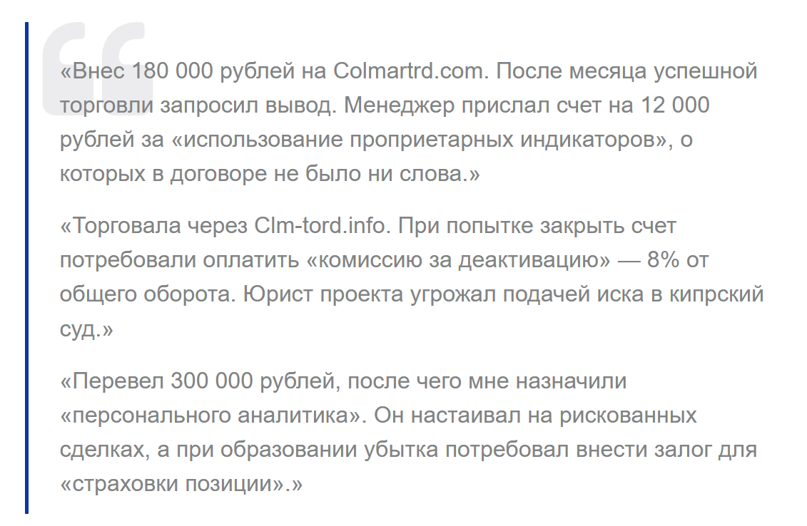 Инвесторы, поверившие обещаниям “стабильного дохода”, в итоге остаются с пустыми счетами и богатым опытом недоверия. Поэтому прежде чем нести деньги на Colmartrd, стоит задать себе простой вопрос: если всё так прибыльно, почему создатели сами не зарабатывают, а зовут туда вас?