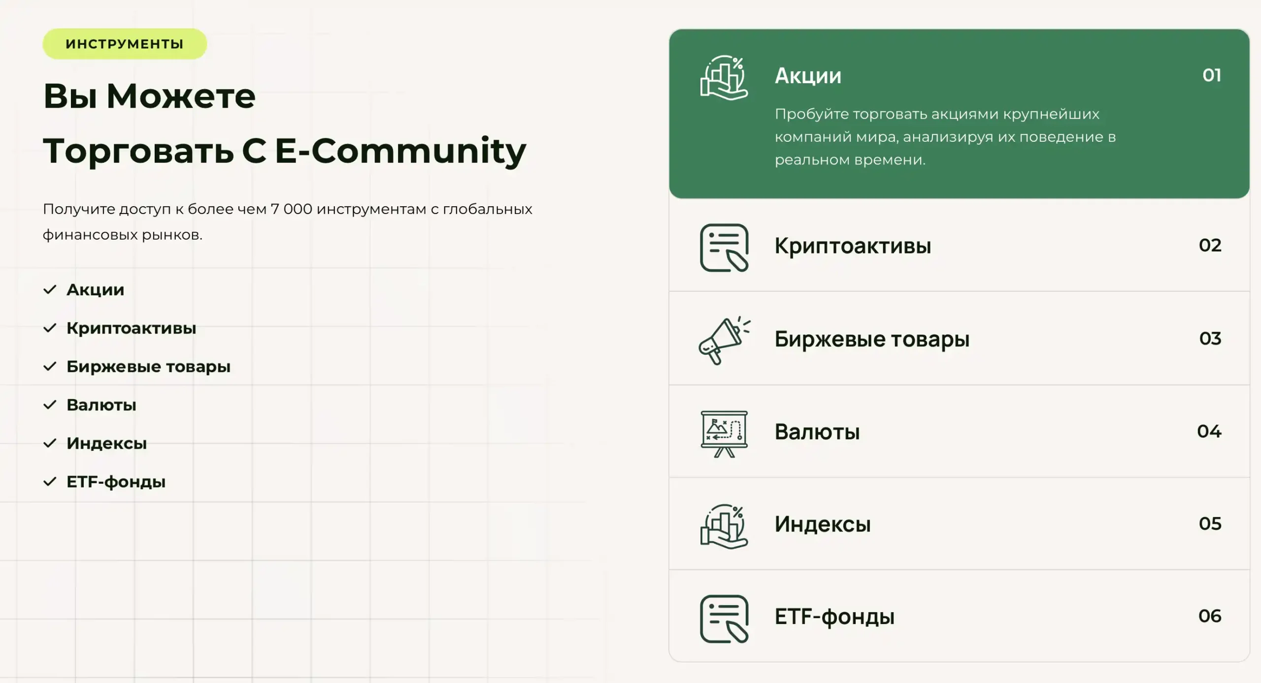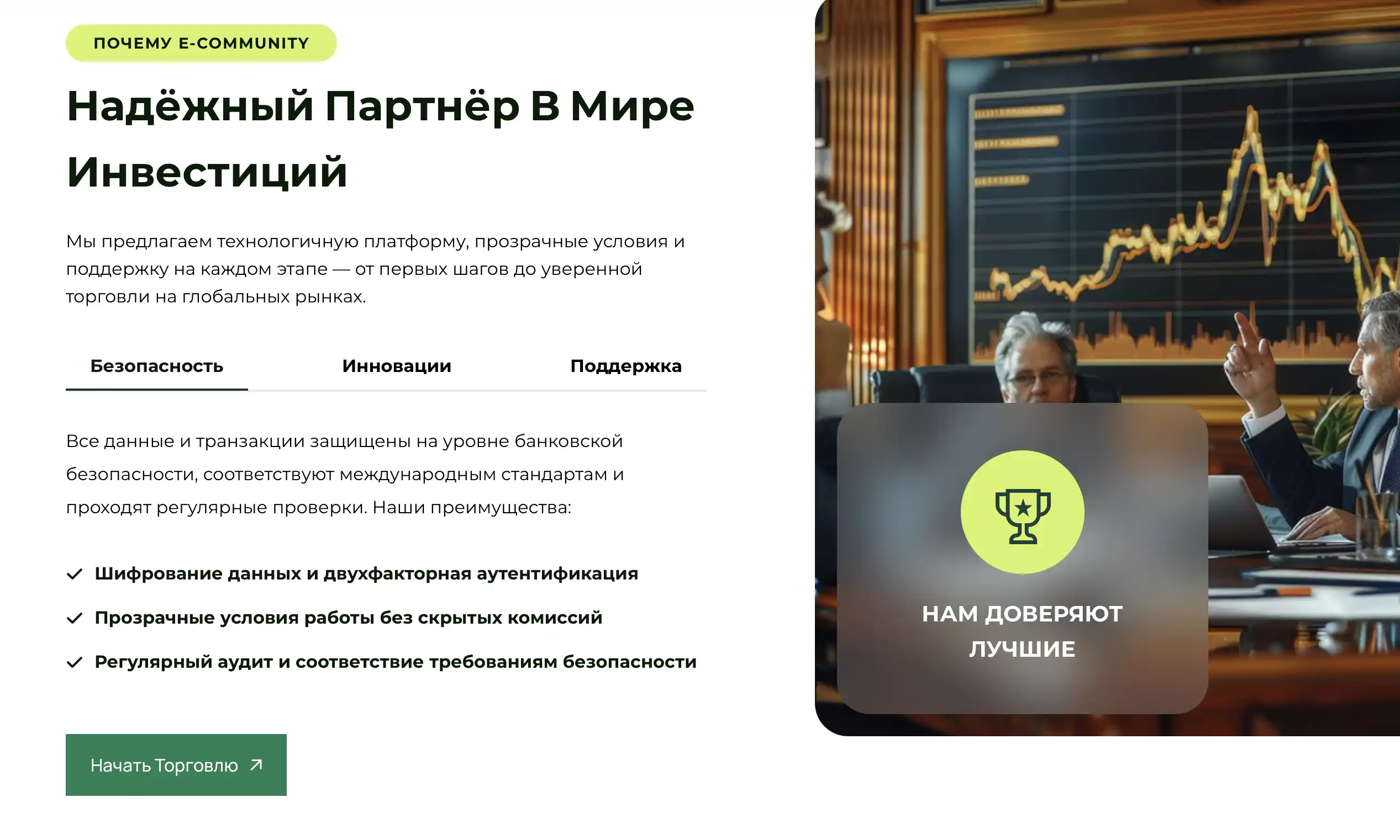 E-Community позиционируется как платформа для инвестиций и трейдинга с элементами социальной сети. На сайте громко заявляют о доступе к тысячам активов, мгновенных выплатах и инновационных инструментах. Всё это выглядит привлекательно, особенно для новичков, которые хотят быстро заработать. Однако при более внимательном рассмотрении становятся заметны существенные противоречия между обещаниями и реальными возможностями платформы.
