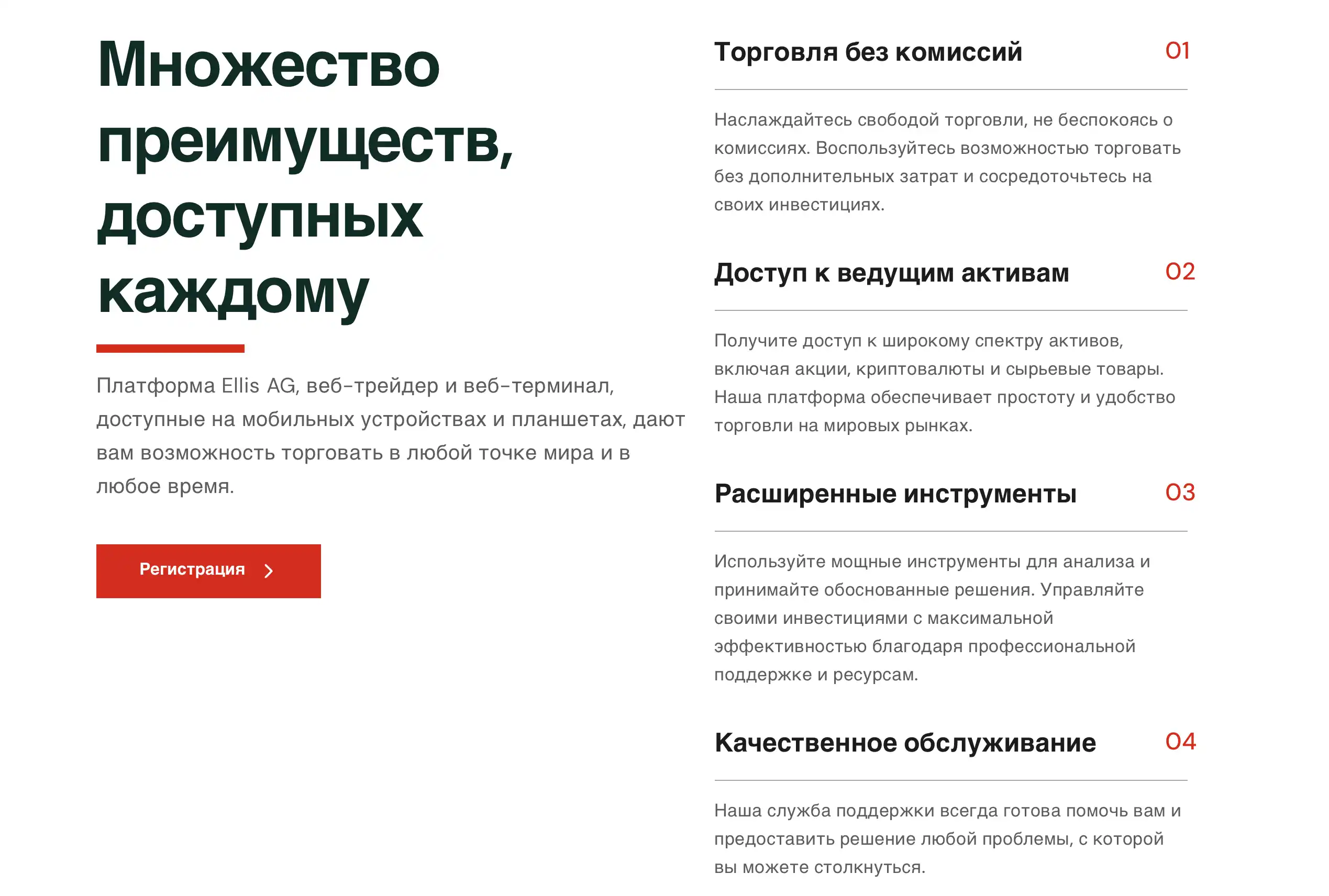 На платформе сообщается, что Ellis AG предоставляет удобные условия: минимальный вход, сопровождение, якобы «открытый» доступ к торгам. В рекламных материалах подчёркивается лёгкость старта и возможность получения прибыли. Всё это создаёт у пользователя ощущение, что перед ним обычный брокер-площадка. Но в публичных разделах сайта практически не раскрыты: