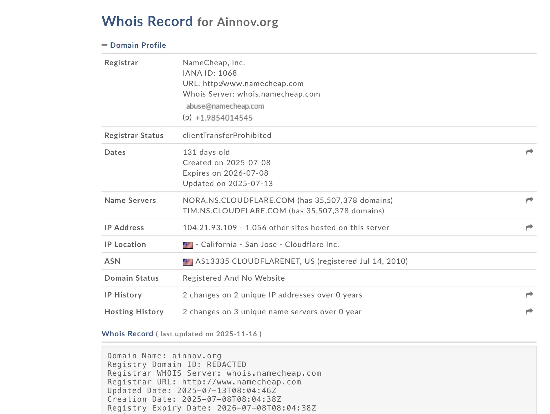 - Возраст домена Ainnov — крайне мал, что увеличивает вероятность рисков, связанных с устойчивостью сервиса.