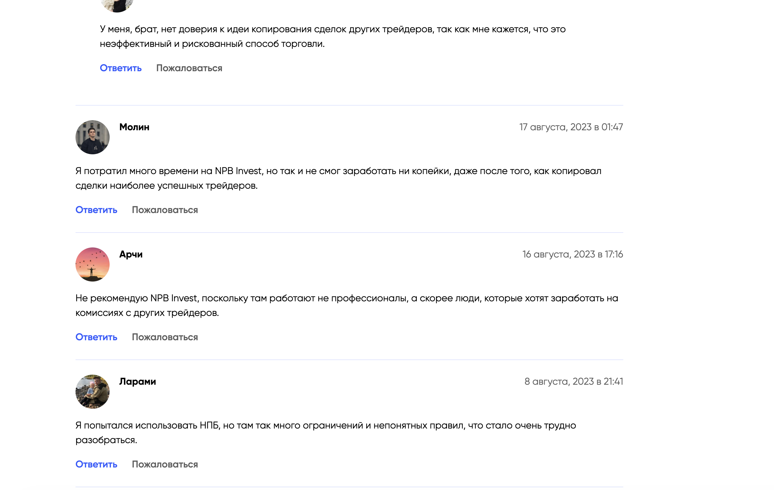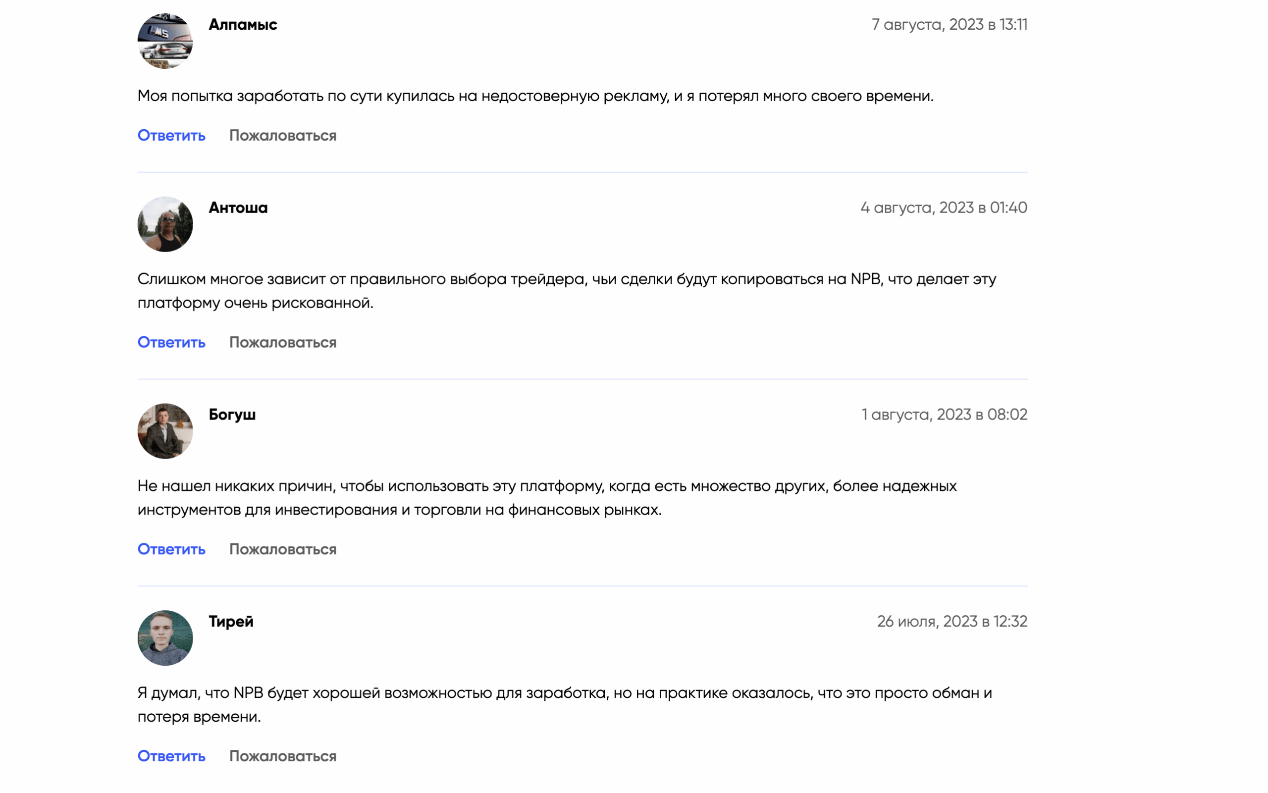 Если проанализировать NPB Invest отзывы, становится понятно, что негативная часть в них преобладает. Люди жалуются не только на медленный вывод средств, но и на навязчивую коммуникацию со стороны «менеджеров», которые предлагают внесение всё большего депозита. Это типичная схема, когда сначала создаётся иллюзия стабильных доходов, а затем появляется «необходимость» пополнить счёт для продолжения торговли.