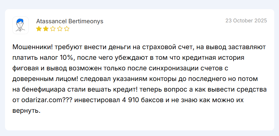 Вывод: несмотря на внешнюю «солидность», Odarizar выглядит как очередная схема для доверчивых инвесторов. Лицензий нет, связи с реальным бизнесом нет, вывод средств проблематичен. Делайте выводы сами — но, кажется, единственная прибыль здесь достаётся тем, кто стоит по ту сторону экрана.