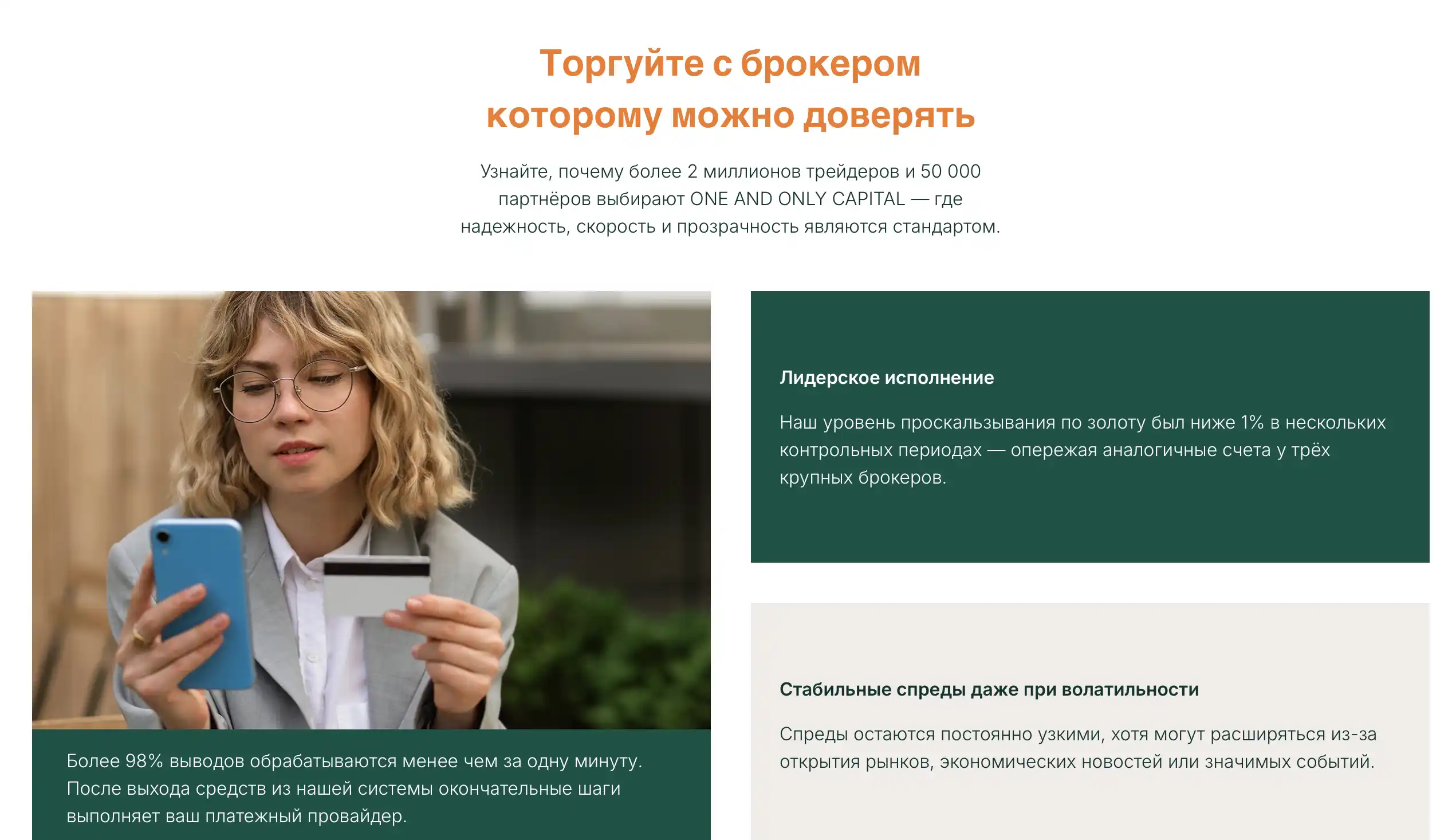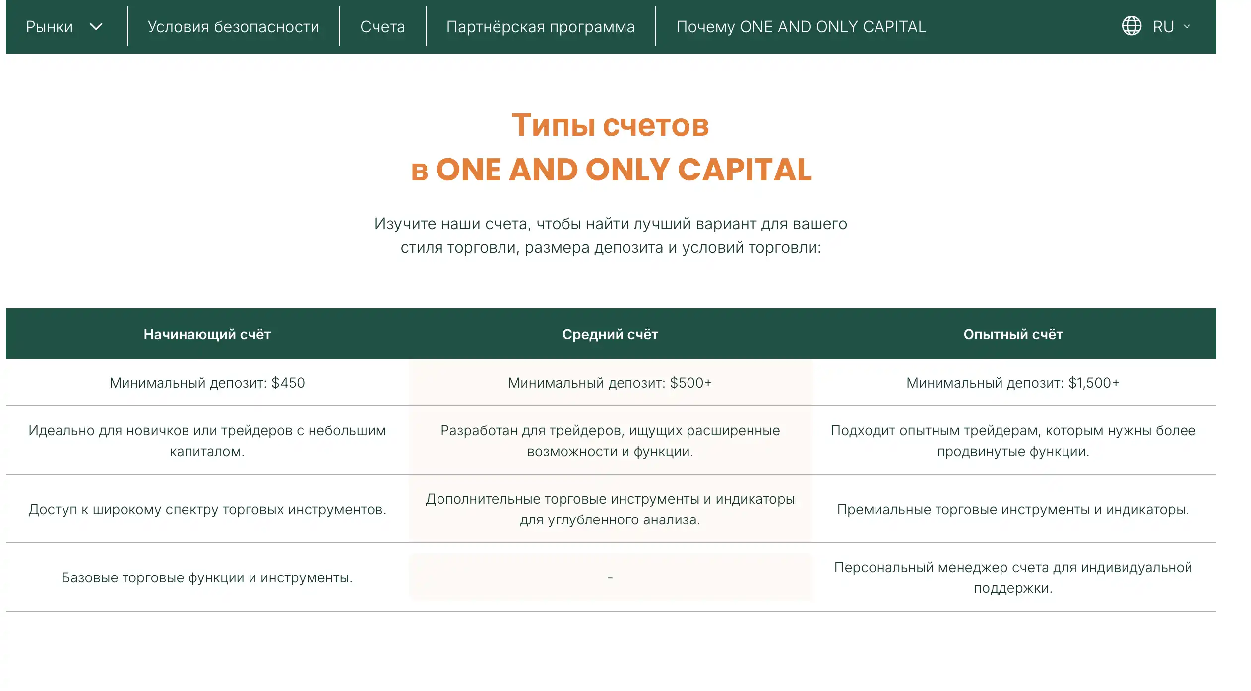 На сайте only-capital.com указано, что брокер предоставляет доступ к торговле валютами, криптовалютами, акциями и сырьевыми активами. Для клиентов доступны несколько типов счетов, персональная аналитика и обучение.