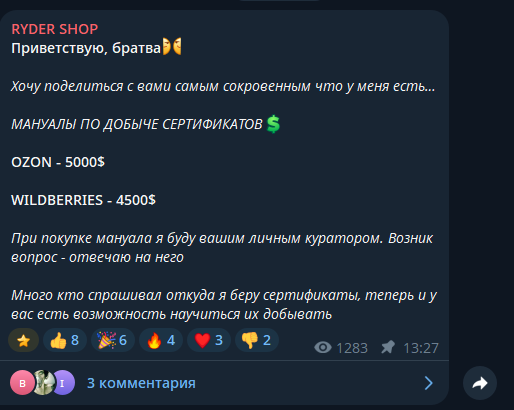 Админ на полном серьезе вещает об эксклюзивном обучении по добыче сертификатов на Ozon и Wildberries номиналом в 5 и 4,5 тысяч долларов! Существуют ли такие сертификаты в природе для обывателей — огромный вопрос. Предложение выглядит максимально сюрреалистично и не выдерживает никакой критики.