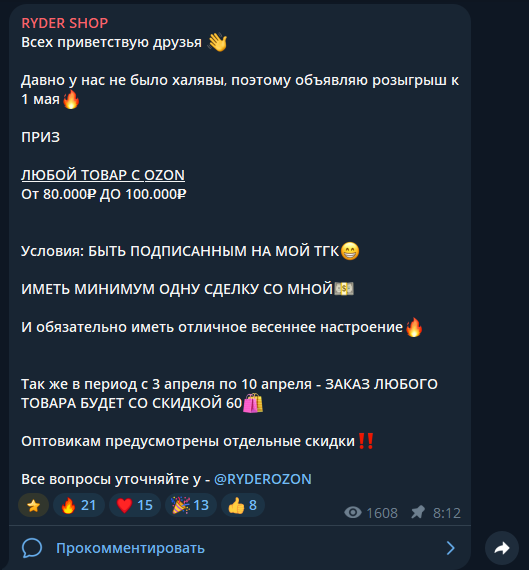 В сообществе регулярно мелькают розыгрыши на товары стоимостью в сотни тысяч рублей. Но есть один гениальный нюанс: главное условие участия — обязательное наличие сделок со специалистом. Сначала вы финансово взаимодействуете с анонимным владельцем, а потом вас, возможно, допустят к призрачной лотерее.