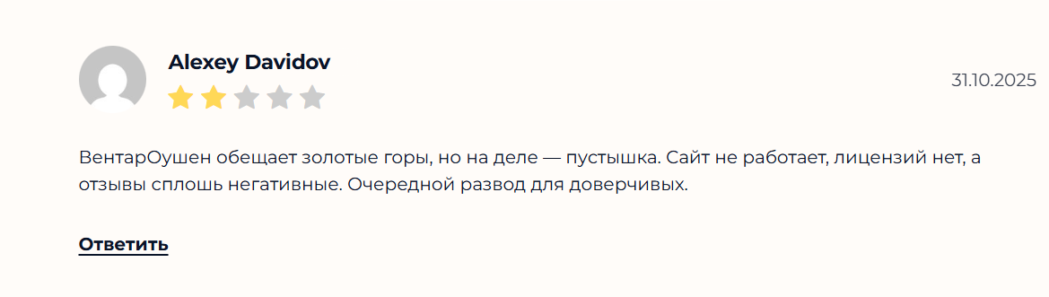 Более того, домен Ventarocean зарегистрирован недавно, а история проекта прослеживается максимум на несколько месяцев. Никаких следов реальной компании, отчетов или официальных партнёров. Такое ощущение, будто сайт собрали на конструкторе за вечер.